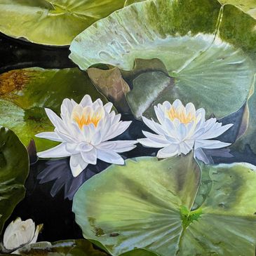 Recently, I found myself drawn to painting the water lilies and pond life, with their rich ecosystems coming from the mud. Depending time of day (the flowers open at daybreak and close mid-day) and a multitude of other factors, the colors and reflections in the water captured my attention and I began painting these images one after another enjoying the unique but complimentary nature of each painting.